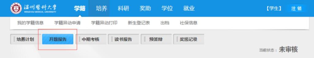 1、学生登录新系统填写开题的内容,通过网址http://xinxi.yjsy.wmu.edu.cn进入系统后点击“培养”→“培养过程”→“开题报告”进入填写页面。带*号部分为必填项,“导师组对预实验的意见”为老师填写,可不填。“研究进度及具体时间安排”如无具体事项请填写“无”。